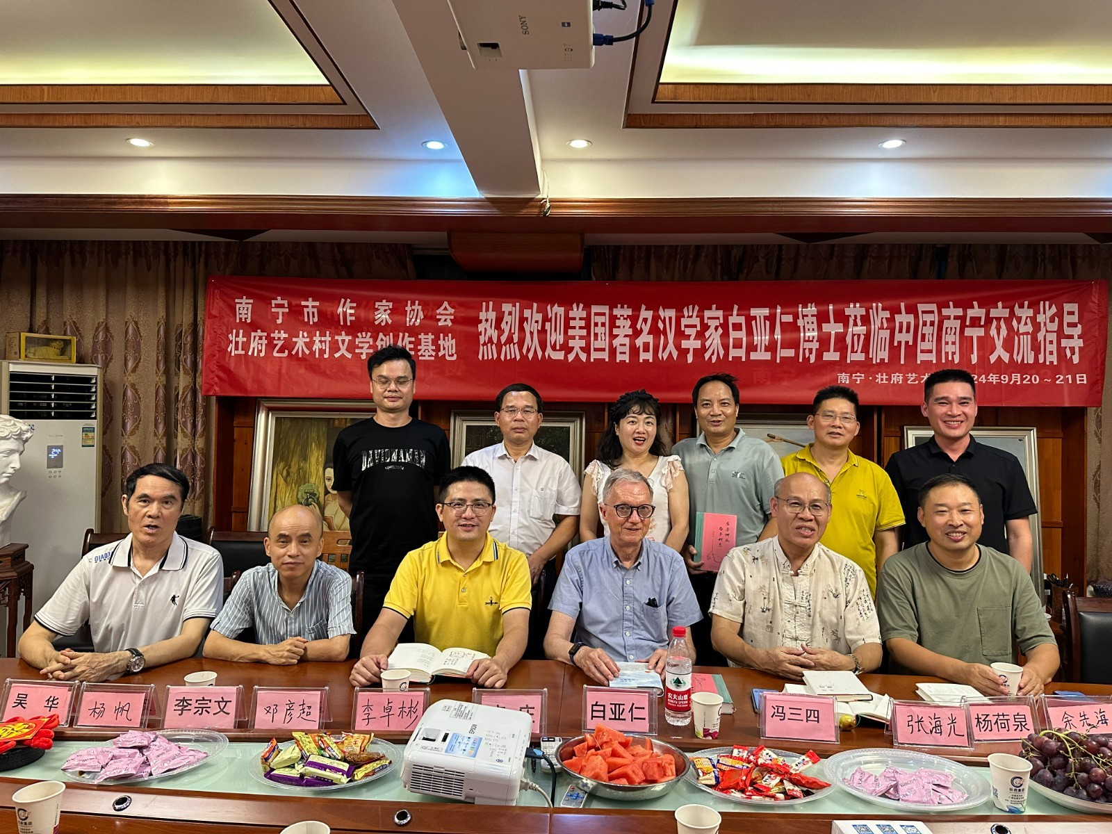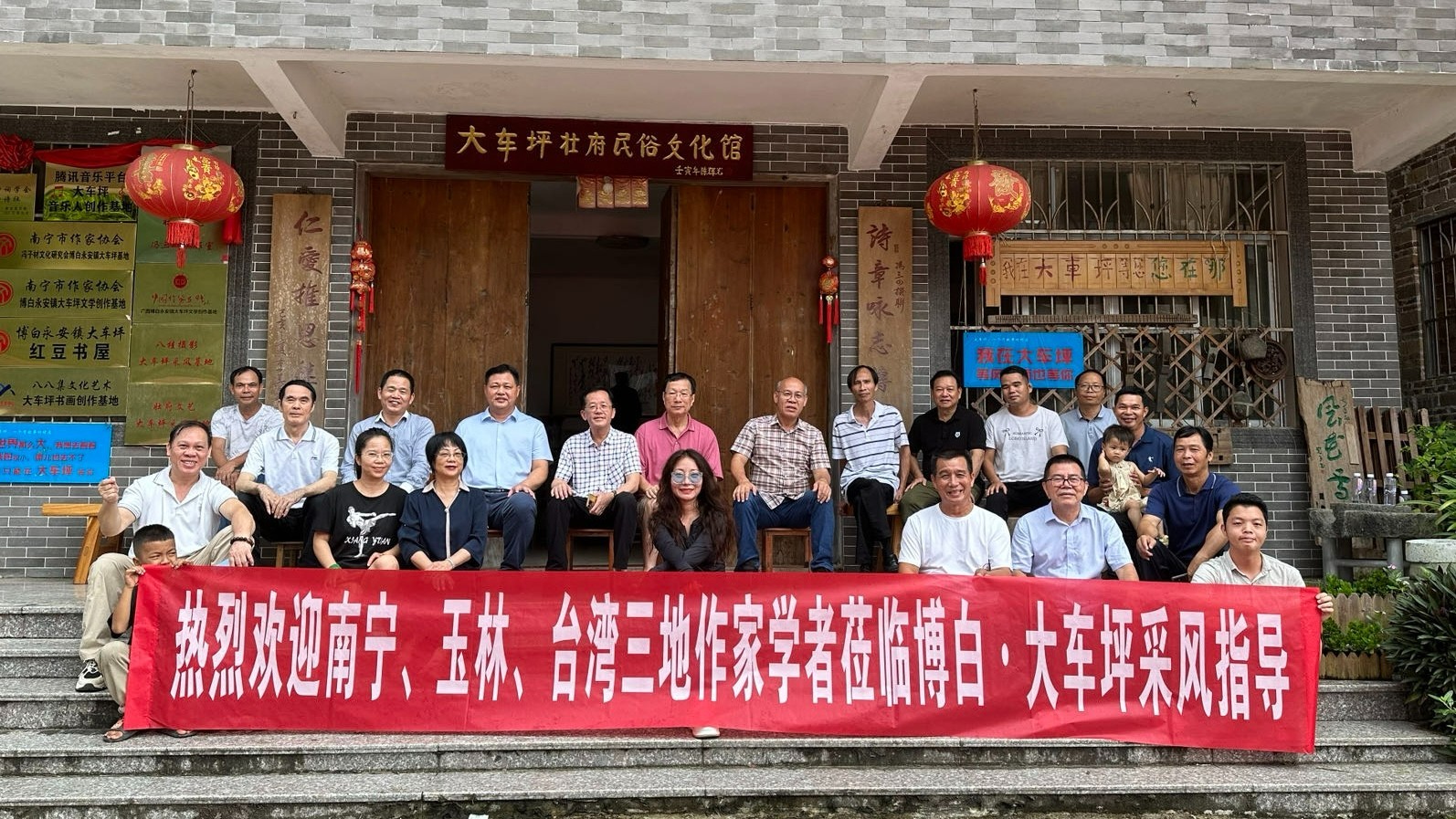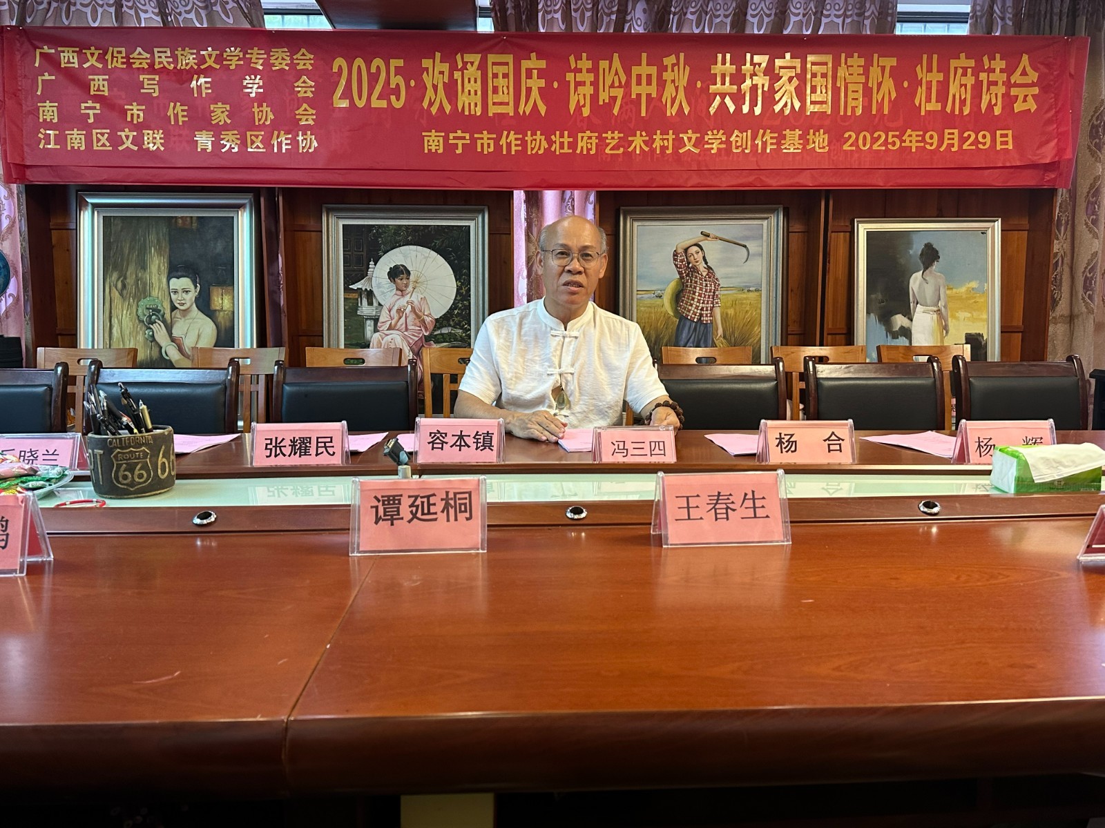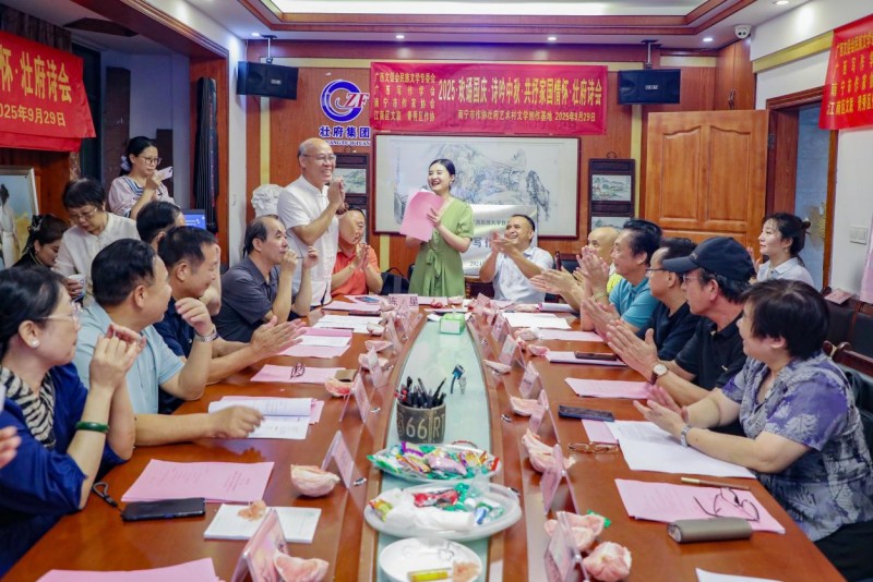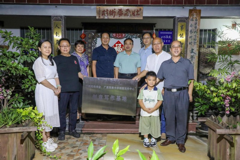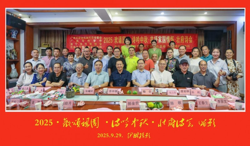 2025年9月29日,广西写作学会、广西民族大学创意写作中心壮府艺术村基地正式挂牌成立暨2025 “欢诵国庆,诗吟中秋,共抒家国情怀”壮府诗会。中国写作学会副会长、广西文艺理论家协会原主席、广西写作学会名誉会长容本镇,仡佬族著名诗人郭金世,壮族作家创作促进会会长黄鹏,中国作家协会会员、南宁市作家协会副主席、广西壮府艺术村村长冯三四等出席授牌仪式,与四十多位南宁作家、文艺家共同见证这一文学盛事。