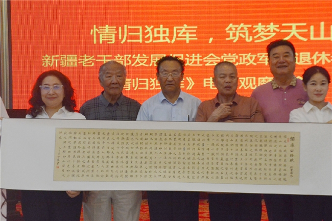 图4、作者刘书环与出席茶话观影会各位领导在《独库公路赋》书法合影图