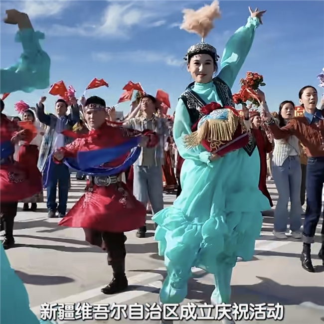 图3:新疆各族人民载歌载舞欢迎中央代表团到达乌鲁木齐