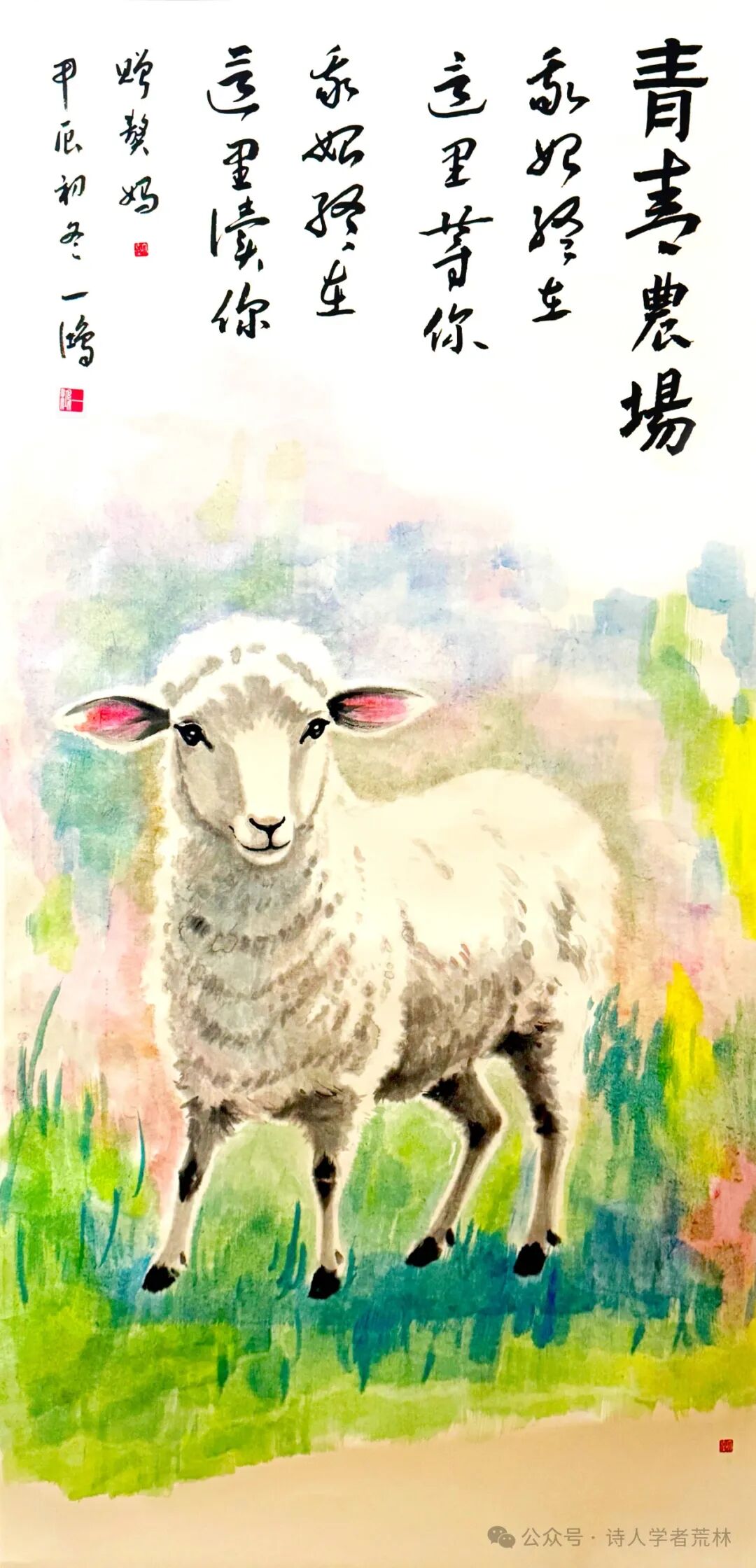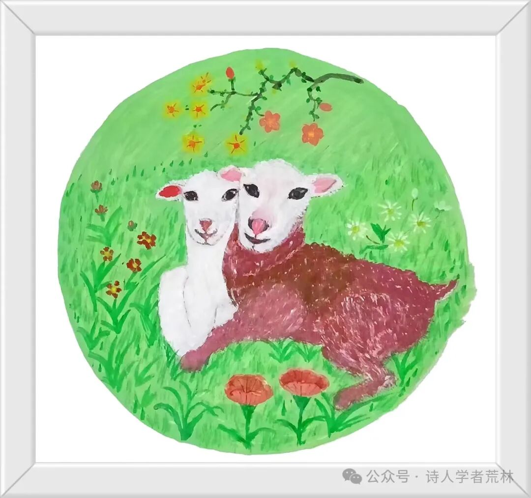 中国摩西奶奶杨佩莲画家的儿子刘鸿艺术家,画孔雀栩栩如生,画老虎能发出呼吸,画狐狸人见人爱。他为诗人獒妈画的美羊,沐浴在青青农场的阳光里,温柔美丽,仿佛是羊的天使一般。
