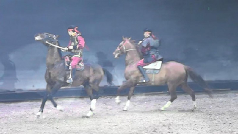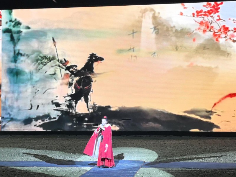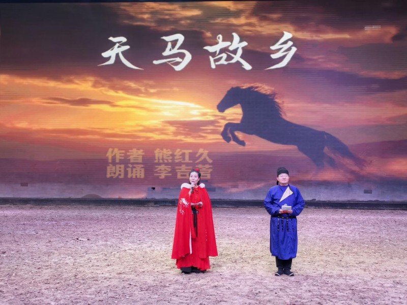 开场,中国诗歌春晚签约朗诵家李吉菪精彩演绎了中国作协全委会委员、新疆文联党组成员、副主席,新疆作协副主席熊红久写新疆伊犁的力作《天马故乡》。接着,中国诗歌春晚签约朗诵家刘磊着唐装扮演李白穿越而来,激情演绎《将进酒》。中国诗歌春晚签约朗诵家吴红随后朗诵了韩愈的名篇《马说》。最后,中国诗歌春晚签约朗诵家暖阳着戎装扮演花木兰表演了南北朝民歌名篇《木兰辞》(节选)。艺术家们精彩的演绎和骑马健儿的矫健身姿融汇成诗歌、宝马、英雄交融激荡的史诗,引爆了游客热烈的掌声和尖叫。