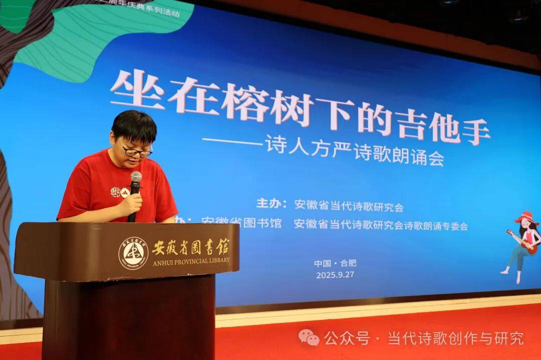 2025年9月27日,“坐在榕树下的吉他手——诗人方严诗歌朗诵会”在安徽省图书馆东二楼举行,中国诗歌学会党支部书记、常务副会长兼秘书长王山,中国诗歌学会副秘书长雁西,《诗潮》杂志社主编刘川,《雨花》杂志社主编育邦,《诗林》杂志社主编安海茵,《上海诗人》杂志社常务副主编孙思出席,并在会上对方严诗歌进行评论,《诗刊》社融媒体中心主任、中国诗歌网总编辑金石开担任学术主持。
