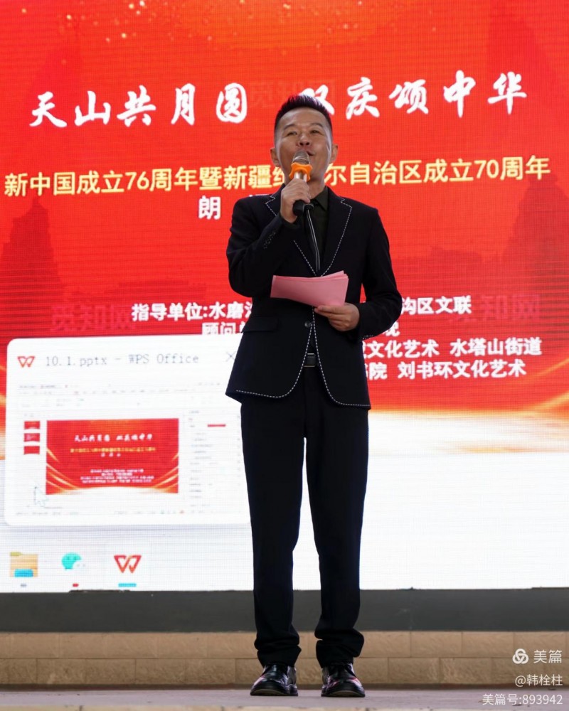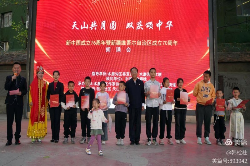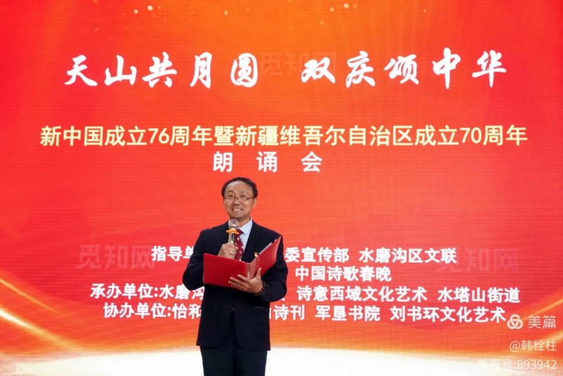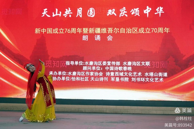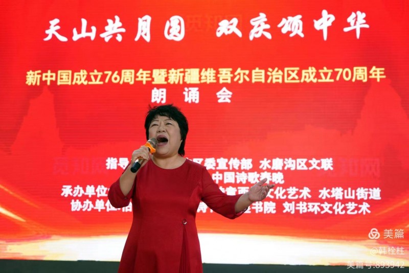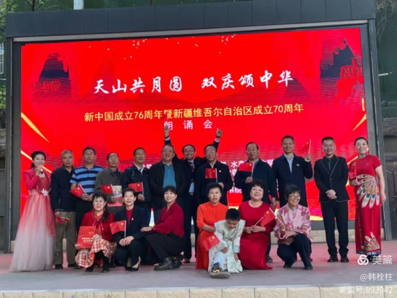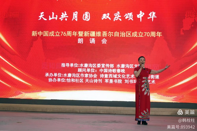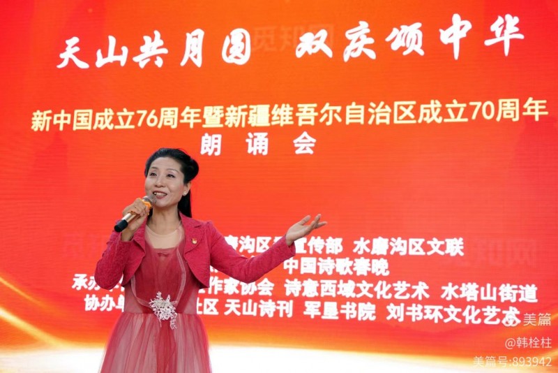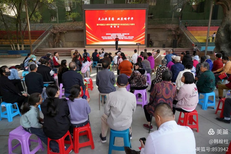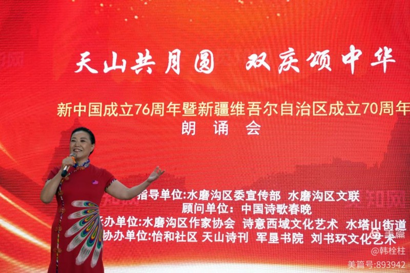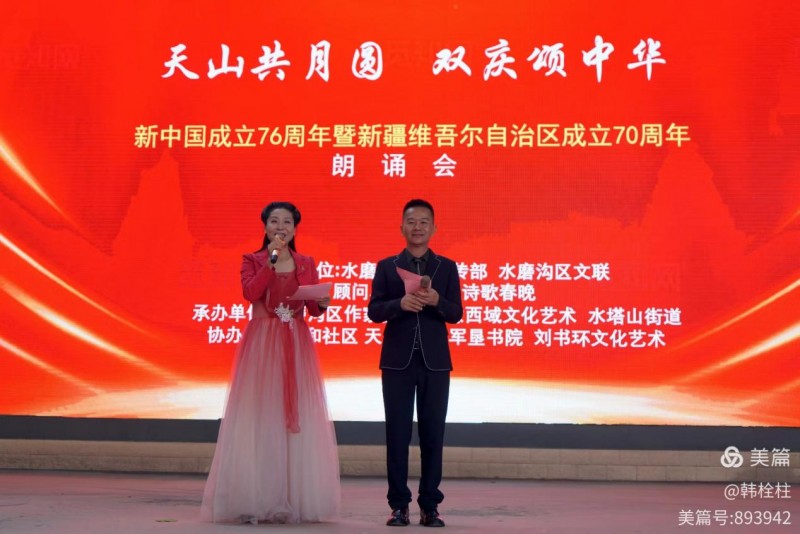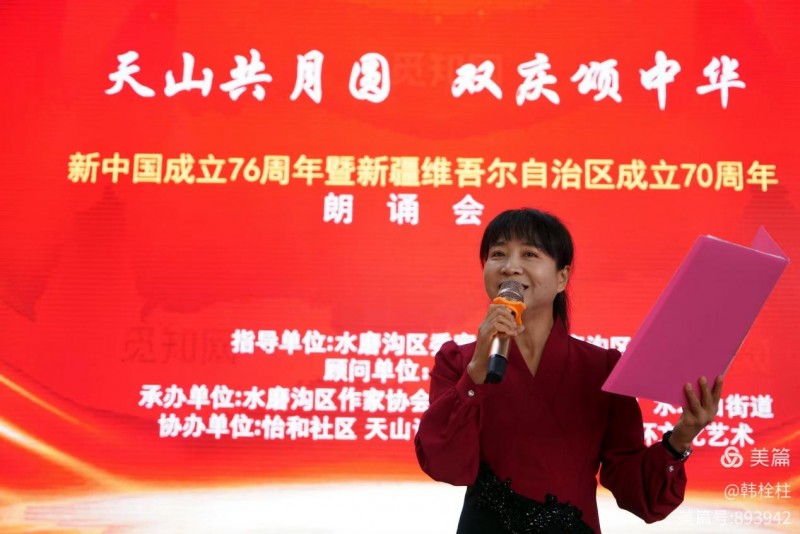 2025年10月1日下午四点,在新疆乌鲁木齐市水磨沟区水塔山街道怡和社区举办了“天山共月圆,双庆颂中华——新中国成立76周年暨新疆维吾尔自治区成立70周年”为主题的朗诵会。
