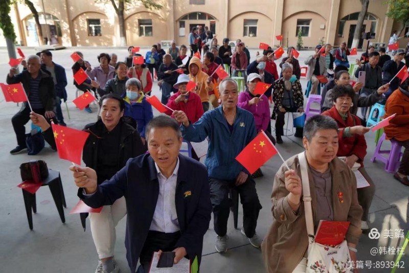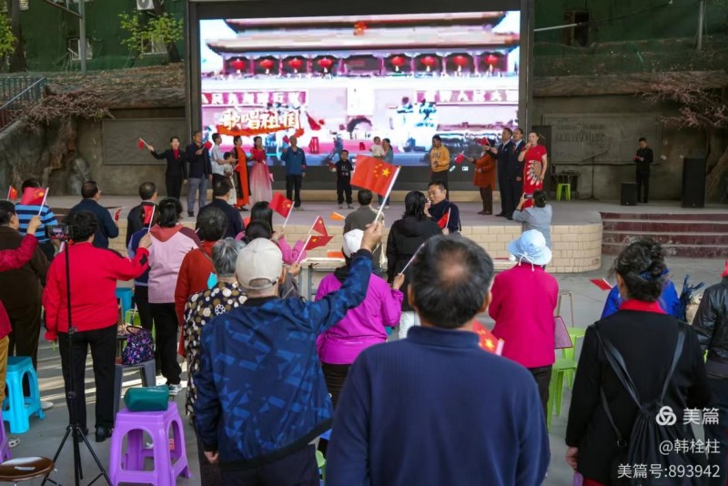 现场嘉宾和社区观众挥舞着手中的五星红旗同声合唱祝福祖国。