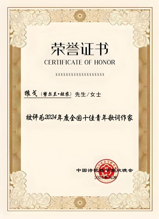 2025年10月5日,狼戈在北京被聘为中国诗歌春晚音乐顾问。此前,狼戈曾被中国诗歌春晚组委会评为“2024年度全国十佳青年词作家”首席。现根据近年的追踪研究,中国诗歌春晚诗歌音乐研究中心特隆重推出此文。