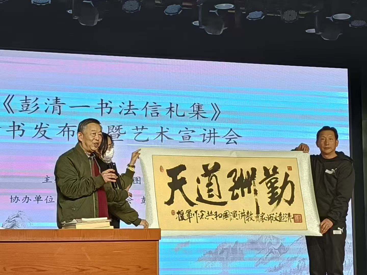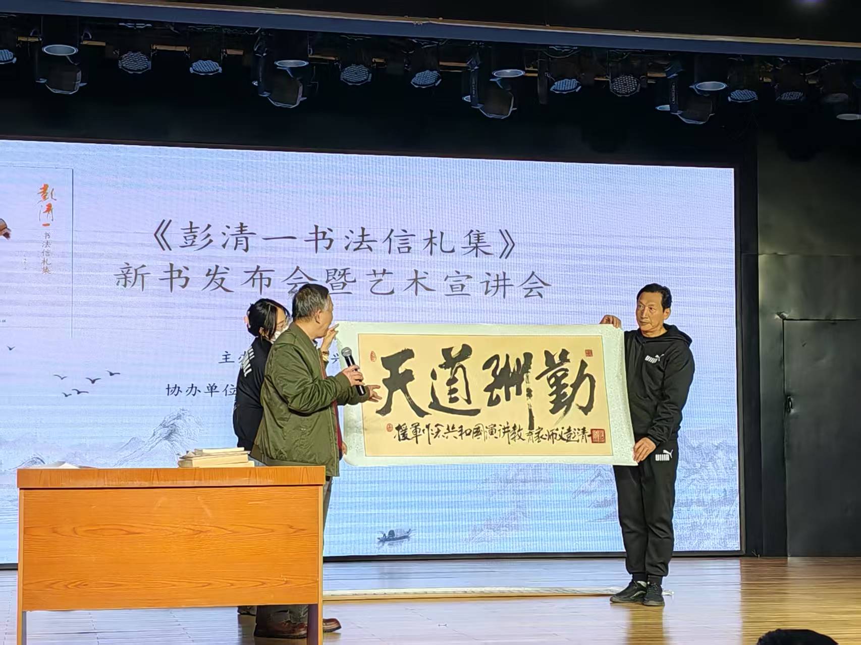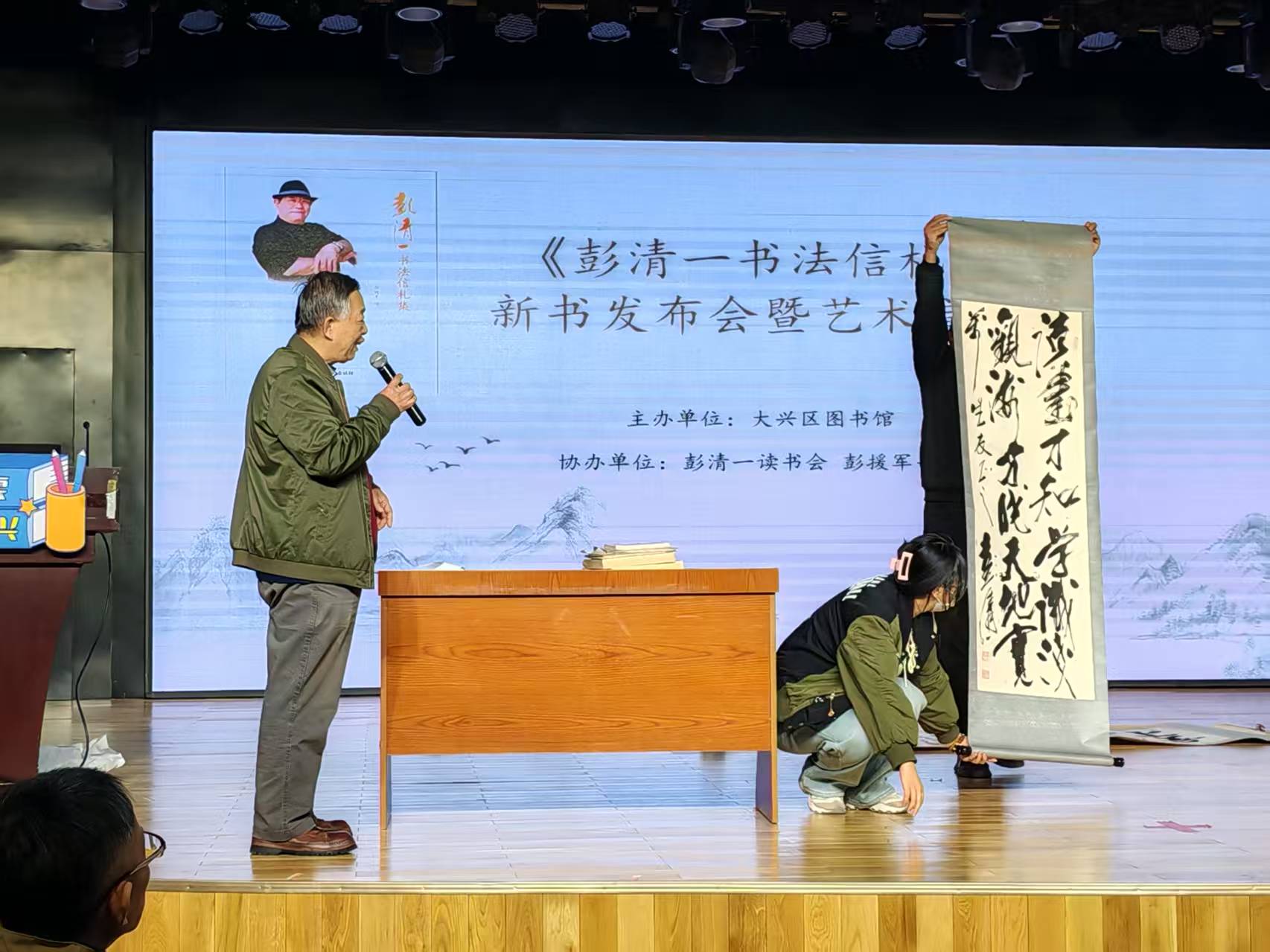 会前暖场,大屏幕播放共和国演讲家彭清一演讲视频,感动着在场的每一位听众。会议开始,大屏幕播放三遍95岁高龄的彭清一致词简短视频,并由朗诵艺术家赵云忠先生诵读彭清一教授致词千字全文,大兴区图书馆副馆长王伟颁发捐书证书。主持人、主讲人、《彭清一书法信札集》编者彭援军现场展示、解说彭清一多幅书法作品及《彭清一精神赋》长卷。