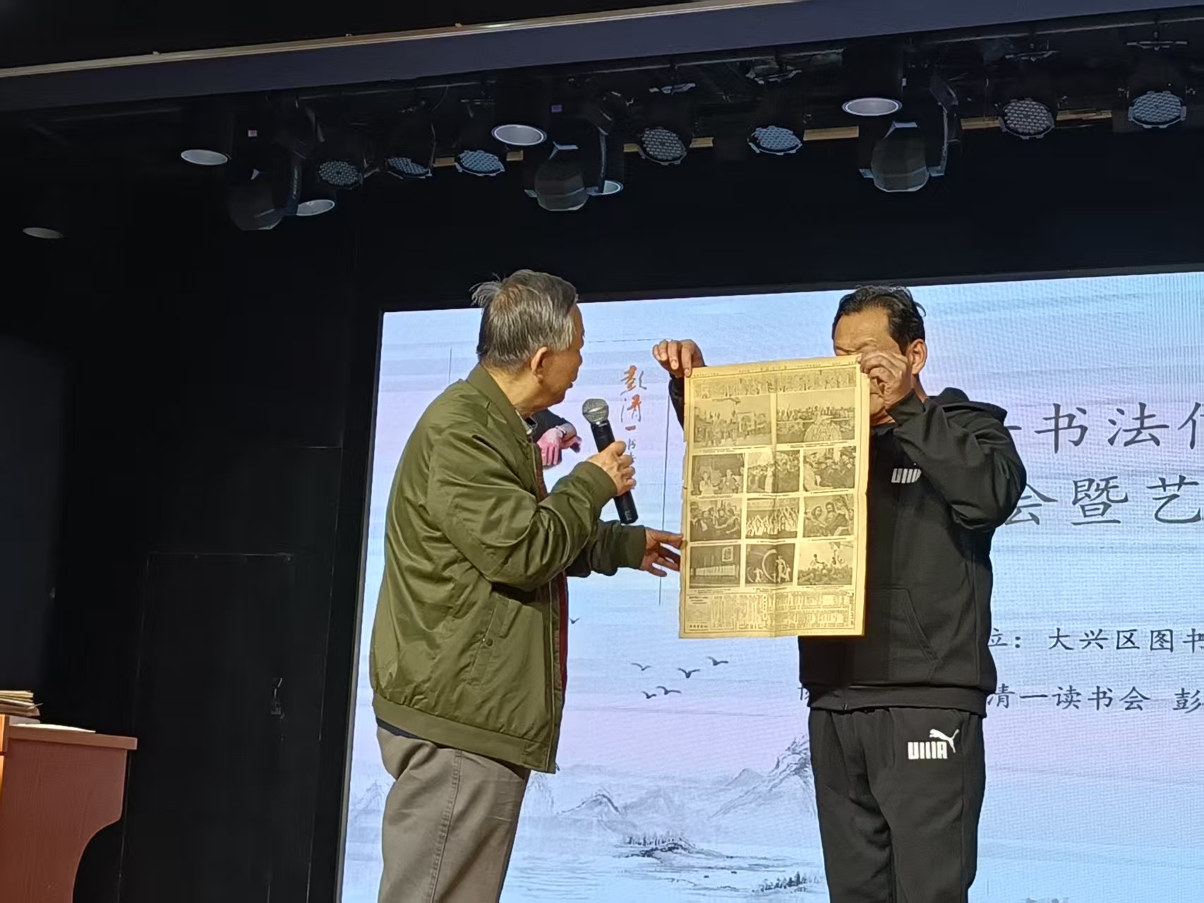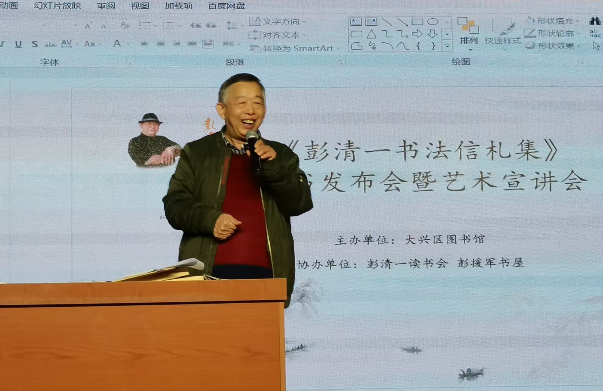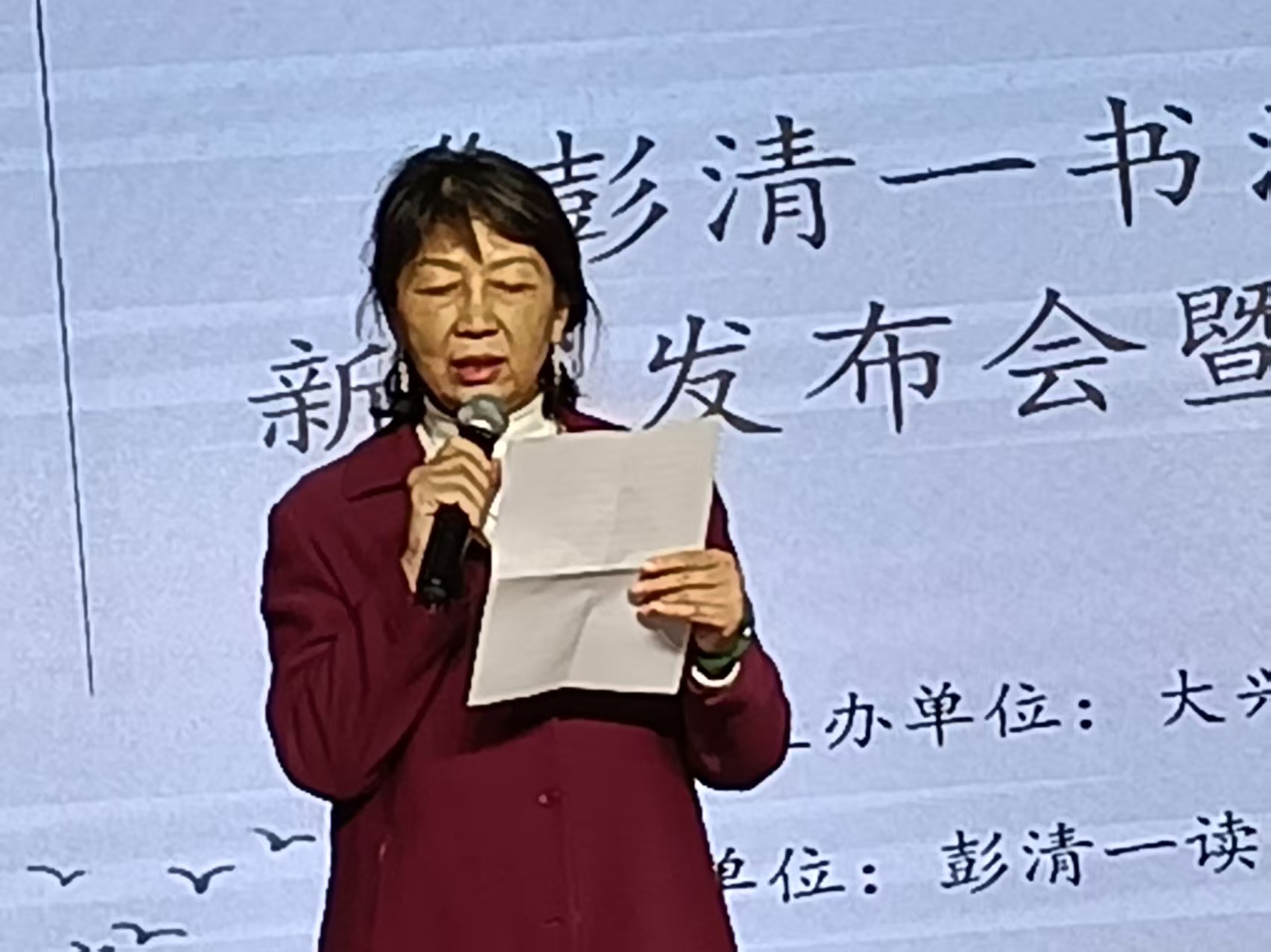 会前暖场,大屏幕播放共和国演讲家彭清一演讲视频,感动着在场的每一位听众。会议开始,大屏幕播放三遍95岁高龄的彭清一致词简短视频,并由朗诵艺术家赵云忠先生诵读彭清一教授致词千字全文,大兴区图书馆副馆长王伟颁发捐书证书。主持人、主讲人、《彭清一书法信札集》编者彭援军现场展示、解说彭清一多幅书法作品及《彭清一精神赋》长卷。