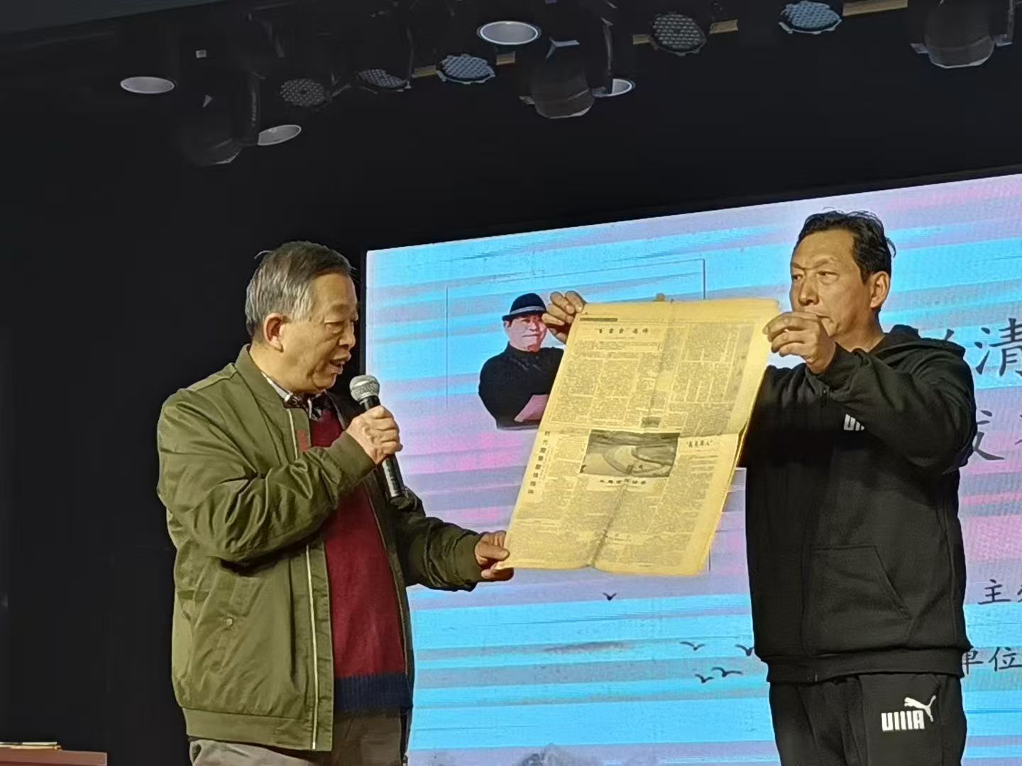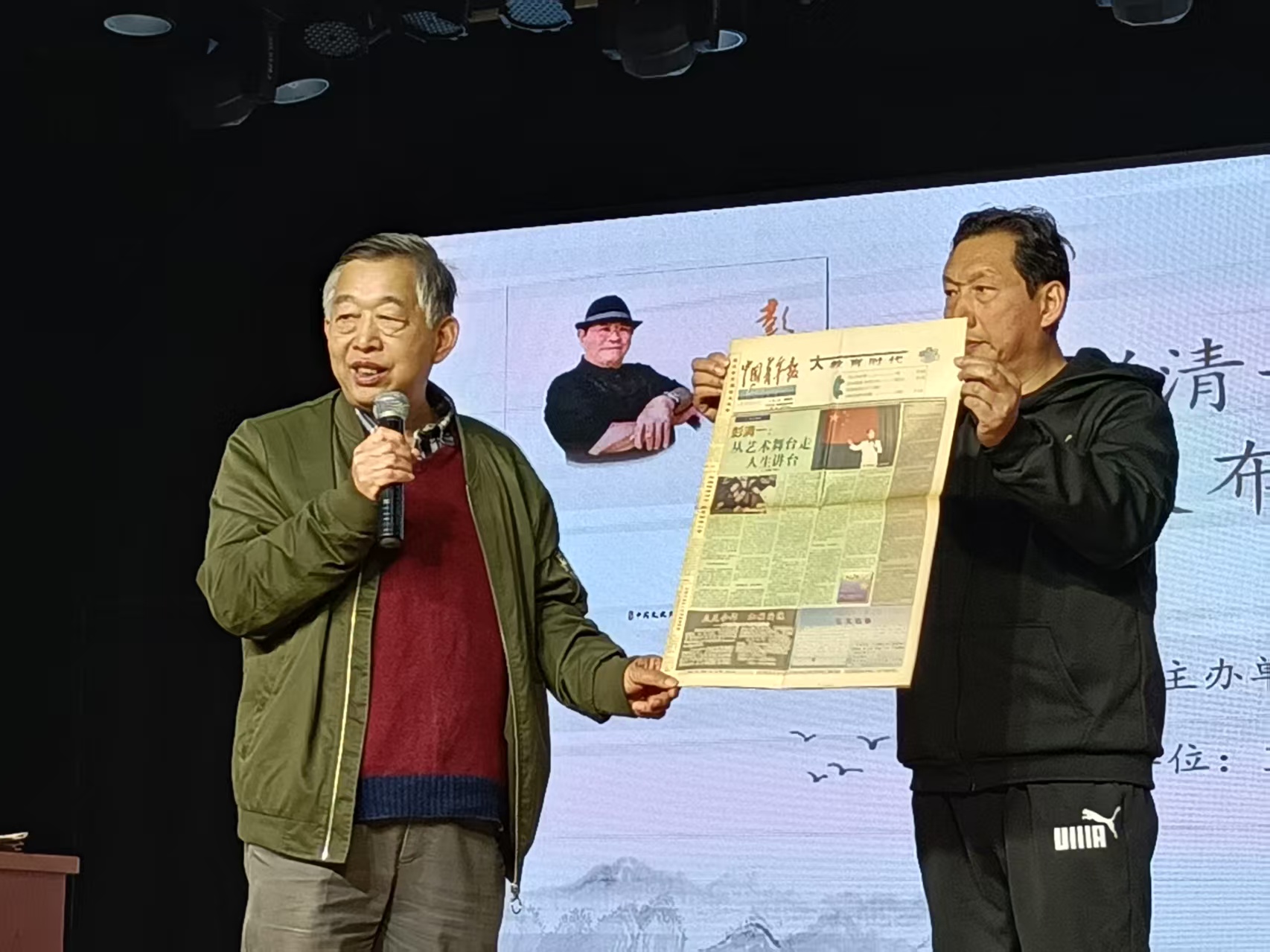 在“诵读彭清一”环节,分别由朗诵艺术家张东之、魏翠萍、杨淑君诵读彭清一演讲提纲《激情成就梦想 责任演绎辉煌》和彭清一致中央人民广播电台新闻中心采访组张昕的两封信。主讲人彭援军展示了他所收藏的刊登彭清一事迹的老报纸,从1951年彭清一随代表团出国访问演出舞蹈《小刀会》,到1965年在人民日报上发表文章,从1985年的演讲老照片,到众多报刊的专题报道。