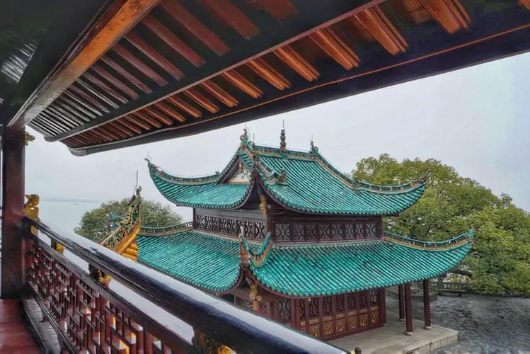 中国古代建筑,大都不是孤立地去表现单座建筑本身的完善,而是凭借周围的自然环境,以群体组成一个和谐的空间。从岳阳楼的选址来看,清代曾经两任岳州知府的张德容认为:“以余观斯楼之屹然而峙也,右挹荆江之波,左临洞庭之胜,前望君山,后耸金鹗,盖全踞岳阳之要。”岳阳楼与洞庭湖、君山岛等周围山湖壮丽景色融为一体,因地构筑,借景而生。“无山水,则楼阁减韵;无楼阁,则山水削色”。所以明代杜庠有《岳阳楼》一诗:“茫茫雪浪带烟芜,天与西湖作画图。楼外十分风景好,一分山色九分湖。”