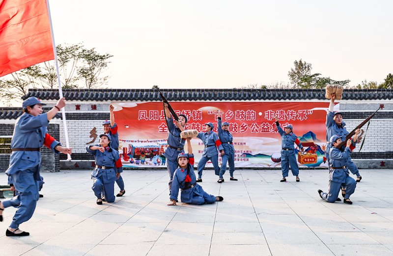 本次活动由板桥镇新时代文明实践所、板桥镇文化站联合主办,凤阳县老体协牵头组织旗下鼓乡艺术团,携手凤阳县文化馆侠进玲艺术剧社等单位联袂献艺。演出以国家级非遗凤阳花鼓、泗州戏、黄梅戏及滁州市级非遗太平鼓为核心,搭配红色主题舞蹈、经典歌曲等多元文艺形式,让现场观众全方位感受传统文化魅力与红色精神传承。