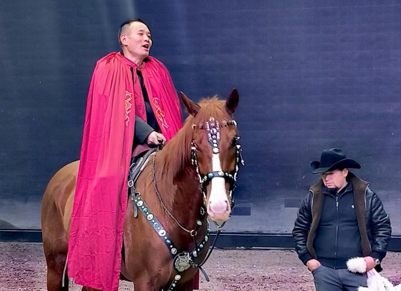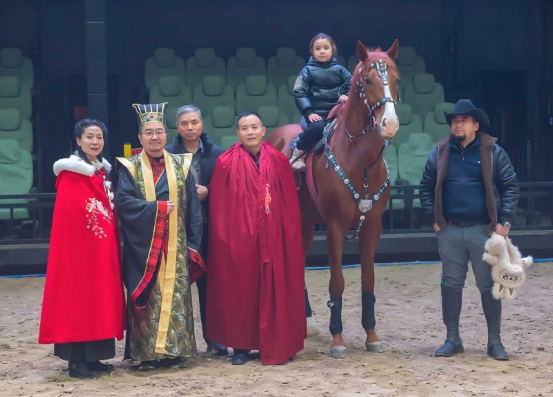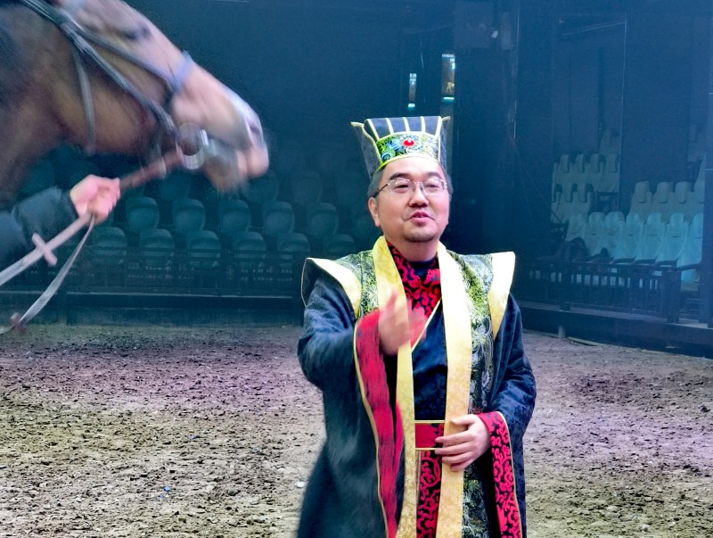 刘磊着装马上演绎诸葛亮:“我乃汉室丞相诸葛孔明,穿越千年之后来到西域明珠乌鲁木齐汗血宝马基地。此马乃马中金贵。当年,我躬耕南阳,今日有幸得见宝马。在此,我携宝马恭祝众位宾朋,富贵吉祥,马到功成!”