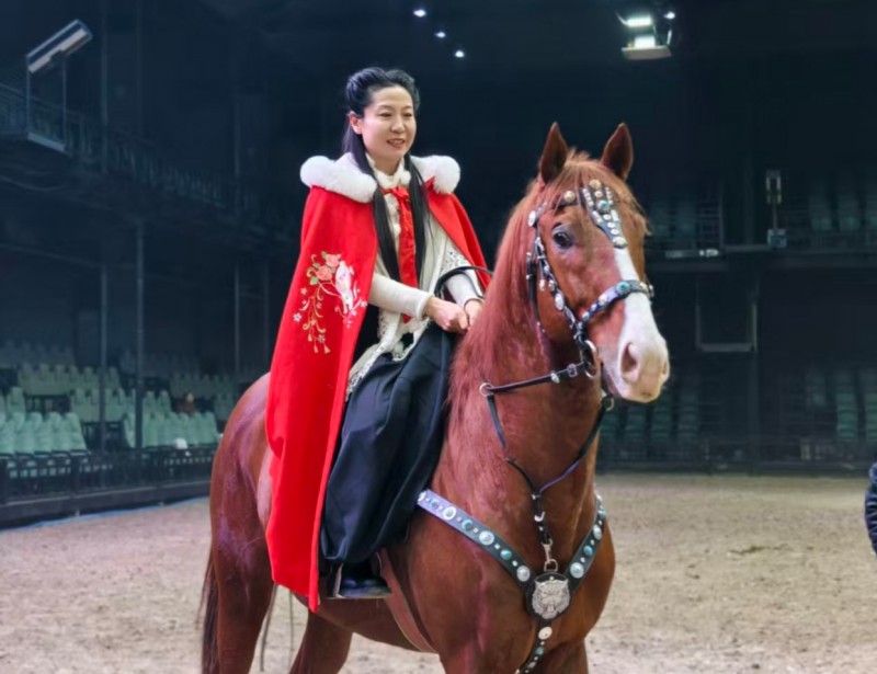 暖阳也着装骑马演绎花木兰,可谓“骑马倚斜桥,满楼红袖招。”