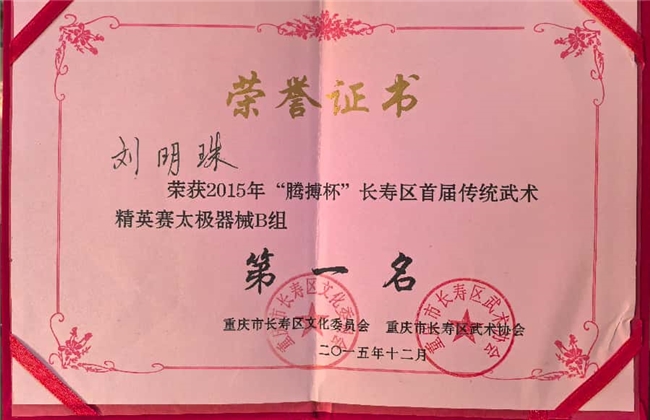 岁月流转,刘明珠褪去戏装,却从未放下对艺术的热爱。退休后,她依旧活跃在舞台之上,积极参与区文化馆的文艺演出活动,远赴铜梁参加汇演。闲时潜心练习太极拳,修身养性间,依旧保持着不服输的韧劲。2014年,71岁的她斩获重庆市第十一届传统武术精英赛一等奖;2015年,72岁高龄的她被分入50岁年龄组参赛,依旧勇夺长寿区“腾搏杯”武术比赛第一名,以实力诠释了“老骥伏枥,志在千里”的风骨。