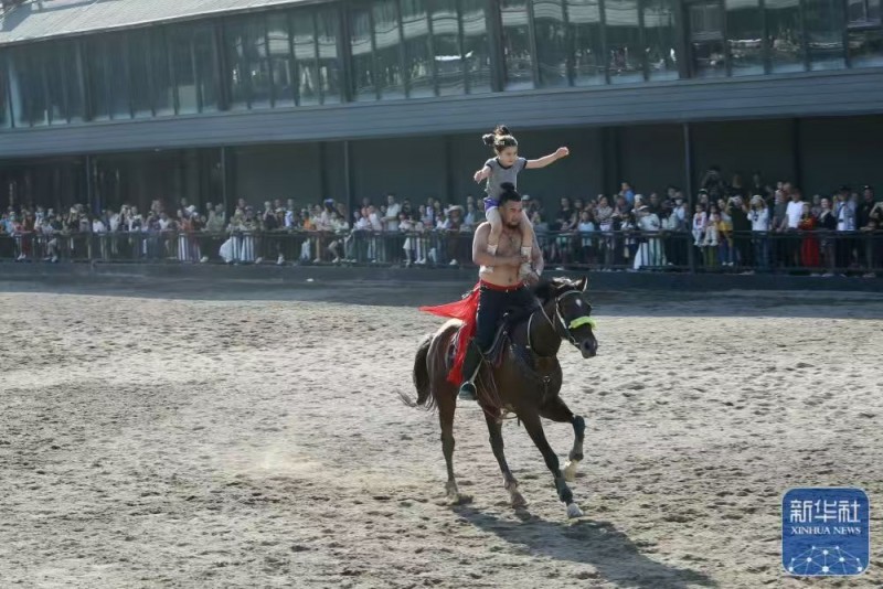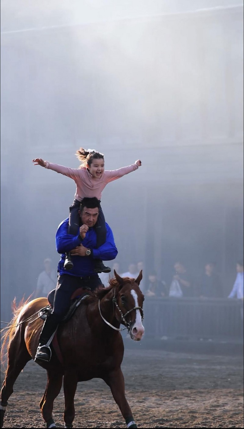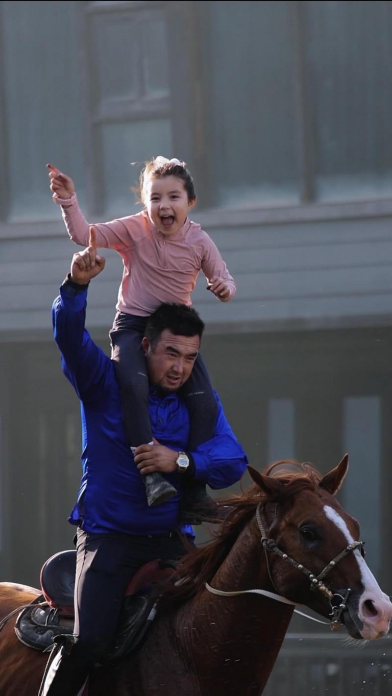 今年夏天,父女二人回到故乡新疆伊犁昭苏,在伊犁天马文化旅游节的舞台上惊艳亮相。当希尔扎提怀抱女儿驭马腾空的瞬间,人与马浑然一体,裙袂随风翻飞,画面宛如灵动的丝路画卷,瞬间点燃现场氛围。观众的惊呼与掌声如潮水般涌来,为这对马术父女的默契配合送上最热烈的赞誉。