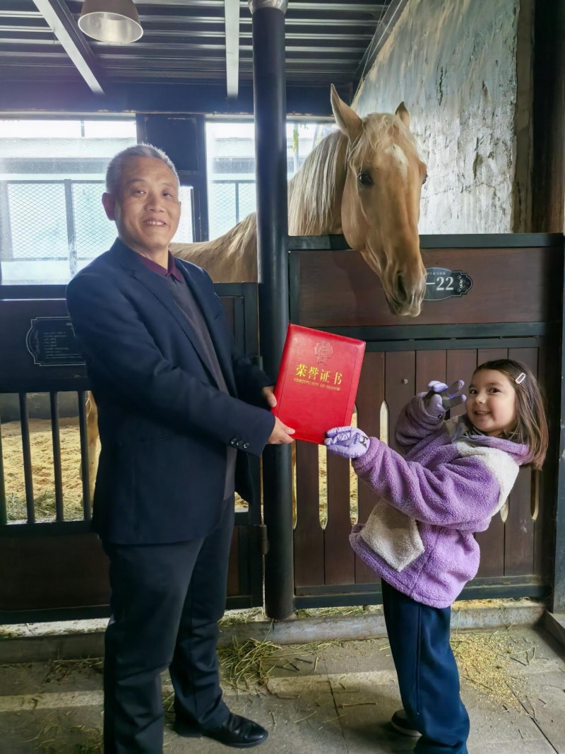中国诗歌春晚总策划、总导演屈金星在乌鲁木齐新疆古生态园汗血马基地的马厩里特意为她颁发了证书。一匹汗血宝马见证这一激动人心、马心的时刻。夏克拉开心地接过证书,笑着说:“我很爱骑马,也喜欢背诗唱歌,当宝马小天使我开心。我在新疆汗血宝马基地等您,欢迎小朋友来和我一起骑马玩。”