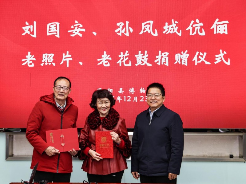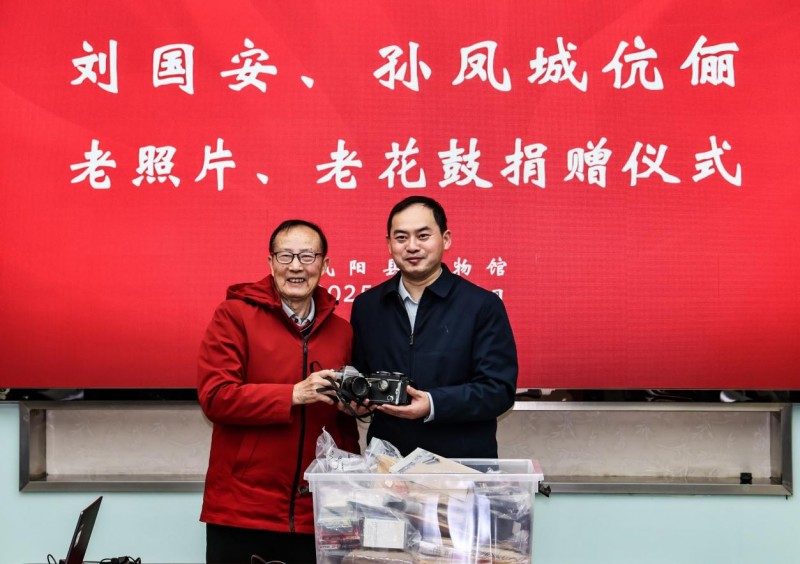 仪式最后,李锦柱等领导和部门负责人为刘国安、孙凤城伉俪颁发收藏证书和荣誉证书,对他们以实际行动践行文化传承的担当给予高度肯定。此次捐赠的文物涵盖影像史料、非遗实物等多个类别,不仅丰富了凤阳县博物馆的馆藏体系,更实现了“无声影像”与“有声鼓韵”的完美呼应,是伉俪二人用毕生坚守向家乡献上的深情告白。