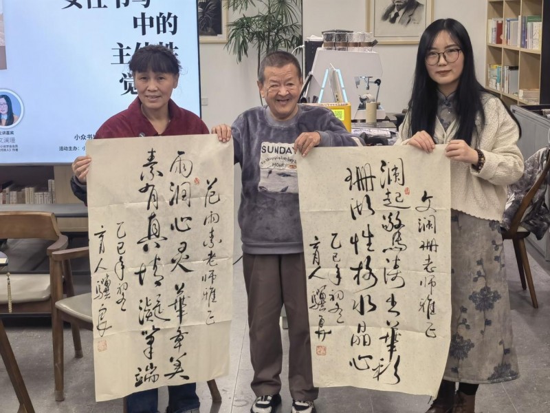 知名盲人作家张骥良听完分享后,热情地向两位主讲嘉宾分别赠送了书法作品,其中,送给范雨素的藏名题字是“雨润心灵华章美,素有真情凝笔端”。送给文澜珊的藏名题字是“澜起惊涛出华彩,珊瑚性格水晶心”。
