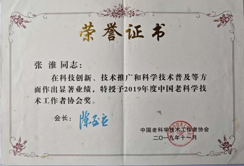 张淮荣获2019年度中国老科学技术工作者协会奖证书