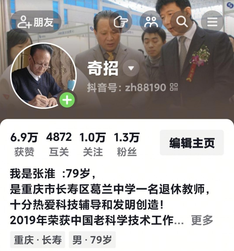 2025年10月18日,带着抖音账号“zh88190 奇招”积累的1.3万粉丝与6.9万点赞,他以新号“zh88198 发明家张淮”正式开启直播征程,用“生命不息,创新不止”的坚守,兑现“为国育英才”的铿锵誓言。