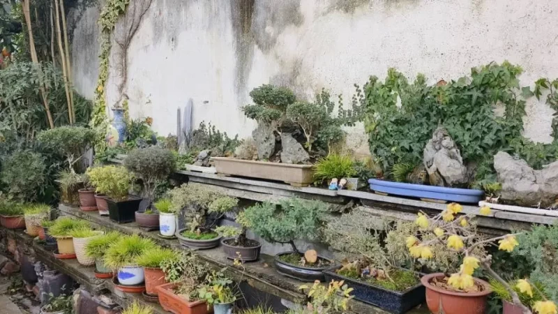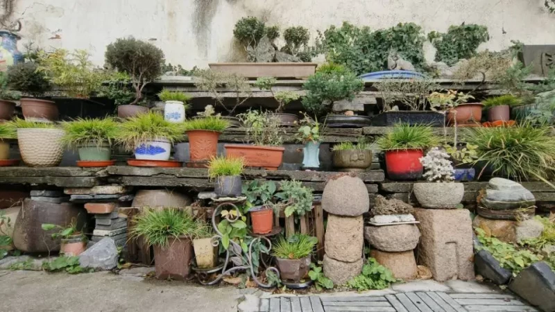 园中最深的秘密,或许便是这些盆景了。它们或坐石台,或倚木架,最小的不过一掌之大。沈复在《浮生六记》中说“小景可以入画,大景可以入神”,至此我方领悟。最可人的是那盆搁在角落的菖蒲,茸茸一簇新绿,生在浅白的瓷盆里。我也曾在案头养过,却总不得活。先生微笑道:“这草最恋旧。盆土的气息稳了,它才肯长得踏实。”我方恍然——我那漂泊不定的案头,终究给不了它一份“旧”的安稳。