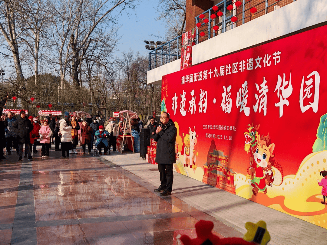 锣鼓喧天迎新年,巧手匠心传非遗。2025年12月28日上午,清华园街道第十九届非遗社区文化节在熊知行楼南广场隆重举办,以“传承文化瑰宝·共享非遗魅力”为主题,集结舞狮展演、非遗手工体验、趣味互动游戏等多元活动,吸引千余名居民踊跃参与,让中华优秀传统文化在欢声笑语中落地生根。