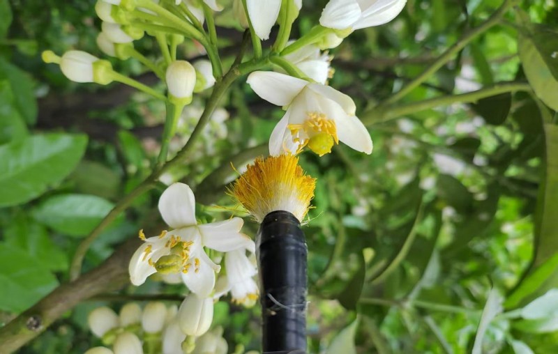 四月初,柚树开花了,白色的小花缀满枝头,满园都是淡淡的花香。可洪向阳却不敢放松——4月10日左右,是花蕾蛆和红蜘蛛活跃的时期,他要及时喷洒杀虫剂,确保柚花不被虫害侵扰。到了4月25日,授粉的活儿来了。他提前把红心橙花蕾放在阳光下稍晒,取出花粉装在瓶里,然后拿着毛笔给柚花授粉。这活儿看似简单,实则讲究极多:有的柚花长在高处,他就搭着木梯;有的长在树中间,他就举着竹棍;有的长得太密,他就趴在树枝上,对着花朵一朵一朵地轻点。每一朵花都要授到粉,还要保证分布均匀,不能有遗漏。而且授粉必须选在晴天,从上午8点开始,忙到下午6点,这样一干就是10天左右。胳膊酸了,他就揉一揉;腿站软了,他就坐在树下歇会儿。他说:“每一朵花都是果农的一个希望,不能马虎。”